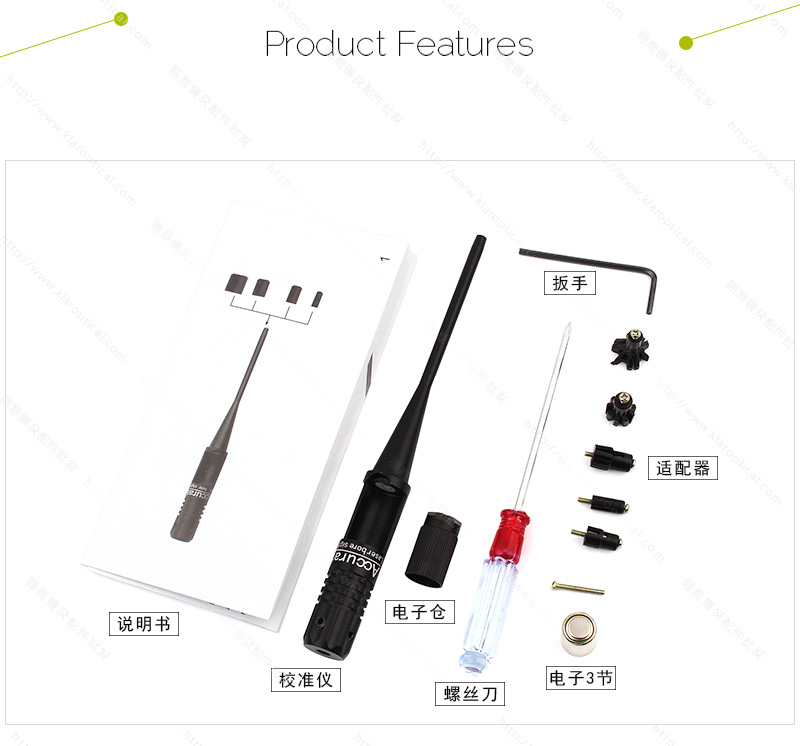使用简介:尾部安装和调节上正确的适配器,然后插入膛中,使之于膛线在一直线。通过瞄准观测鱼雷射光点,使与光点重合即可。同理可以调节红光和激光瞄准器
